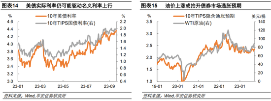 政策逻辑:加息或未止。7月会议以来,支撑美联储继续加息的因素更多:一是,美国经济出现上行风险;二是,油价上涨威胁美国通胀回落前景。我们倾向于认为,美联储11月再加息一次概率较大。首先,美联储进一步确认了终端利率为5.5-5.75%(即年内再加息一次)为基准预测。其次,鲍威尔发言仍在尽量避免释放“停止加息”的信号,11月会否加息将极大程度上取决于经济数据。最后,在11月议息会议前,只有一个月的经济数据以供观察,经济和通胀出现剧烈变化的概率不大,因此近期数据显得较为重要,而这些数据指向美联储有能力、或也有必要再加息一次。