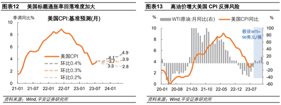 二是,油价上涨威胁美国通胀回落前景。近期国际油价在OPEC+延长减产的主要驱动下快速上涨。WTI油价已从7月会议时的80美元/桶左右,升至目前的90美元/桶以上,涨幅超10%。假设9月及以后WTI油价维持90美元/桶,那么未来几个月美国油价同比将重回正增长,增大标题通胀率反弹风险。