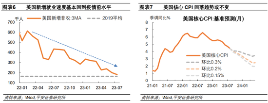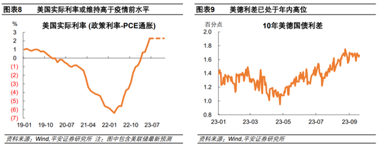 美联储已经接近加息终点,就此市场和政策层已基本达成共识。从9月经济预测看,年内可能最多也只有一次加息;从鲍威尔讲话中,其强调了“双向风险”进一步趋于平衡,且美联储正在谨慎行事。从近期数据上看,美国就业市场延续降温趋势,目前新增非农已经基本回落到疫情前水平;美国核心通胀仍呈回落趋势,在基数效应下未来仍有回落空间。而且,随着通胀改善,美联储即便维持当前利率,实际利率也有望维持2%以上的较高水平。此外,欧央行已经释放停止加息的信号,美联储面对的外部压力有所缓解,未来10年美德国债利差有望维持相对高位。