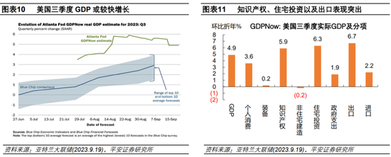 一是,美国经济出现上行风险。美国三季度经济数据仍然强劲,近一个月GDPNow模型结合各类经济数据的预测,指向美国三季度GDP环比折年率在5%左右(截至9月19日预测为4.9%,得益于知识产权、住宅投资以及出口增长)。这一增速可能明显超出美国2%左右的潜在增长率(CBO今年最新预测为1.7%)。我们认为,美联储所希望的图景是未来美国经济以略低于趋势增长水平的方式运行,这样有利于通胀逐步回落至2%目标。但如果经济增长过强,美联储势必需要在转向上更加谨慎。
