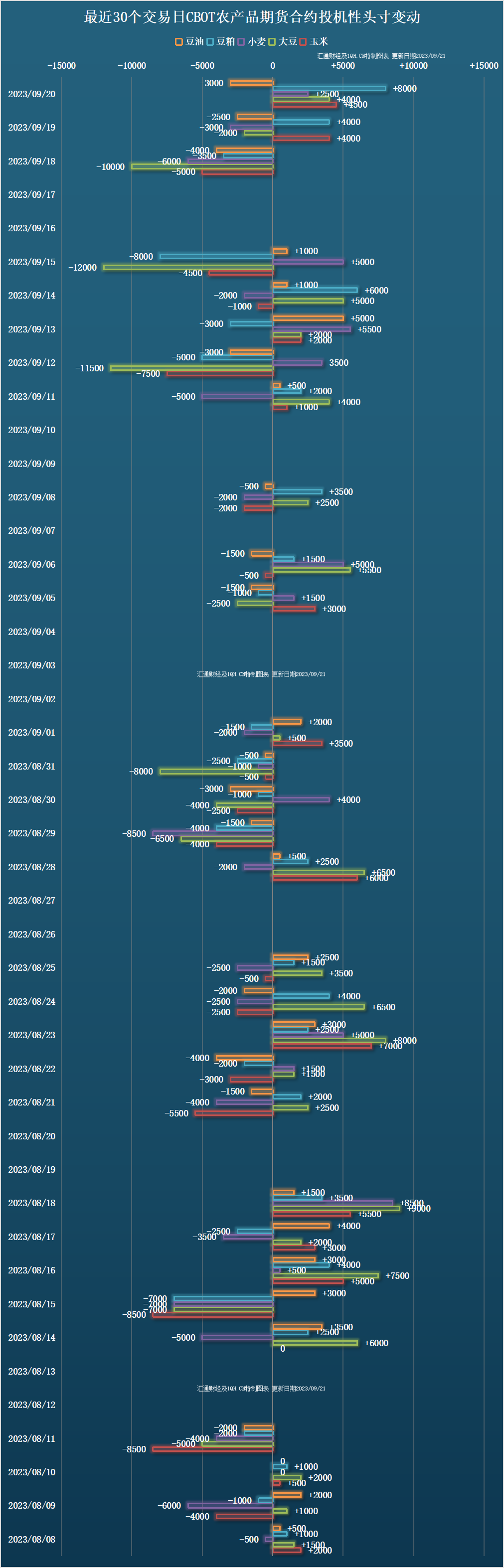 交易商估算的结果显示,大宗商品基金9月20日增加豆油投机性净空头寸,增加玉米、豆粕、小麦、大豆投机性净多头头寸。最近30个交易日,大宗商品基金增加小麦、玉米投机性净空头寸,增加大豆、豆油、豆粕投机性净多头头寸。