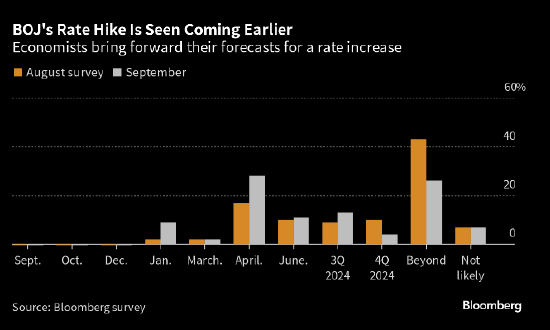 在《读卖新闻》对植田和男的采访内容发布后,日本央行观察人士上调了加息预期,其中半数预计2024年上半年会加息,市场甚至预计会更快行动。