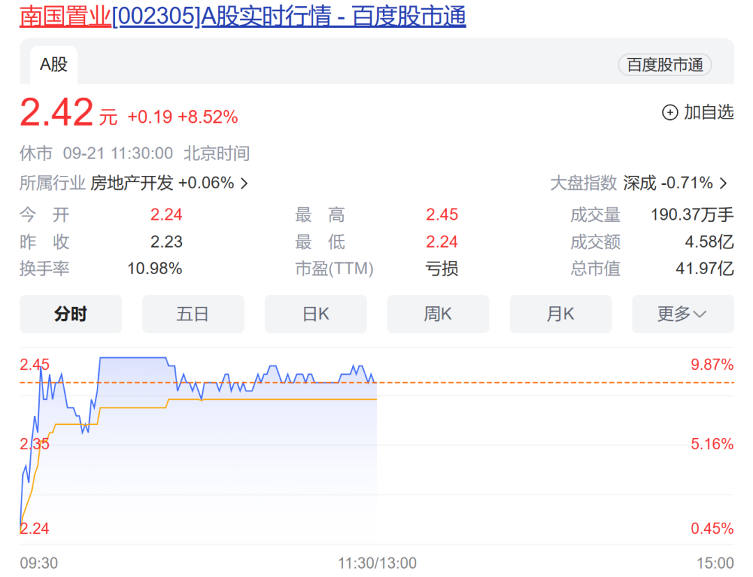 房地产板块盘初一度高开高走,直线拉升涨逾1%。南国置业盘中一度触及涨停,成交量急剧放大,截至午间收盘,换手率近11%;新大正、特发服务等盘中也一度大幅上涨。