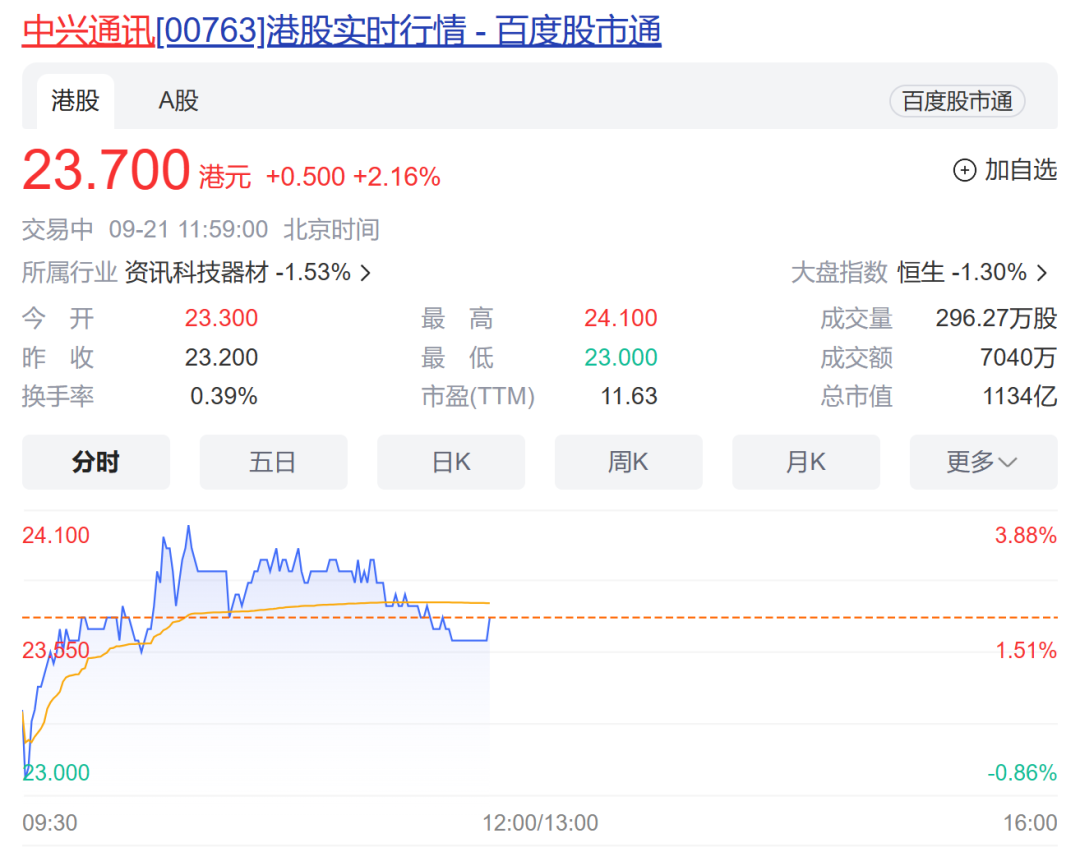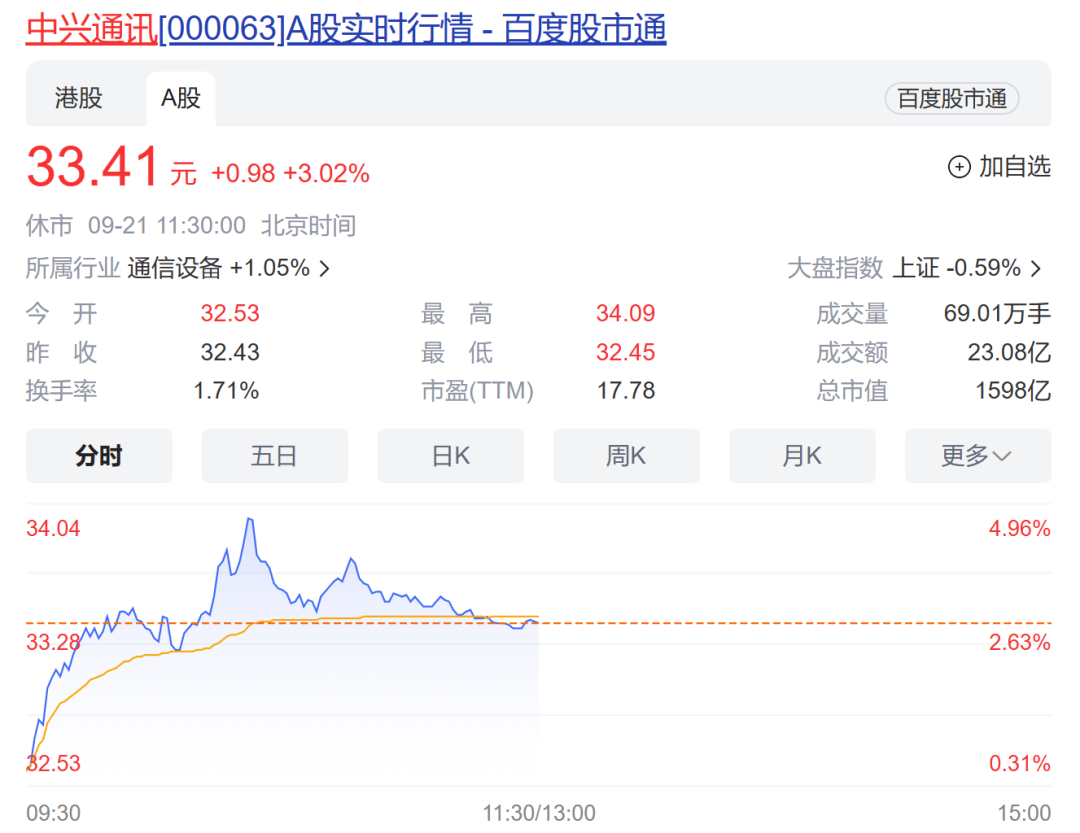 今日,中兴通讯AH股均出现异动,A股盘中一度大涨逾5%,开盘仅半小时成交就超过昨日全天成交。H股亦放量上涨近4%,半日成交超过昨日全天成交。