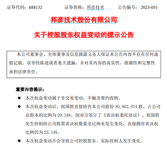 9月20日,邦彦技术(688132)公告称,公司近日收到控股股东、实际控制人、董事长祝国胜通知,其与张岚已办理解除婚姻关系手续,前者拟将其持有的730.7万股股份(约占公司总股本的4.80%)分割给后者。同时,张岚拟将其之后持有股份对应的投票表决权、提名权、提案权等相关权利委托给祝国胜行使。