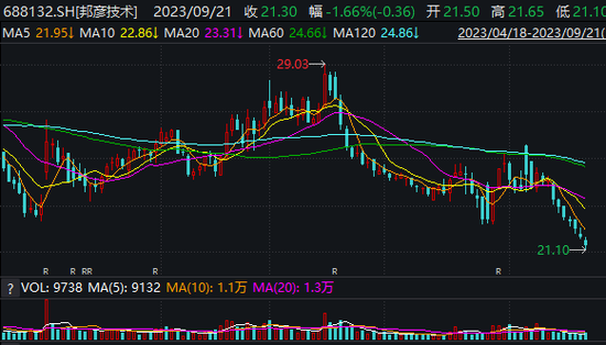 资料显示,去年9月邦彦技术上市时,公司发行价为28.88元/股。然而,截至9月21日收盘,公司股价报21.3元/股早已破发,存在减持限制。此外,公司上一次收盘价超过发行价,还是今年3月23日的29.03元/股,且“一日游”后便很快再度破发。
