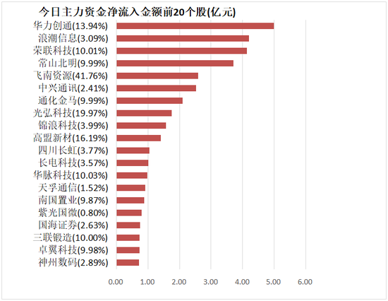 4、华力创通主力资金净流入4.98亿元居首