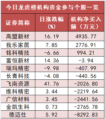盘后龙虎榜数据显示,机构现身11股,其中高盟新材等3股现机构资金净买入,德迈仕等8股呈现机构资金净卖出。