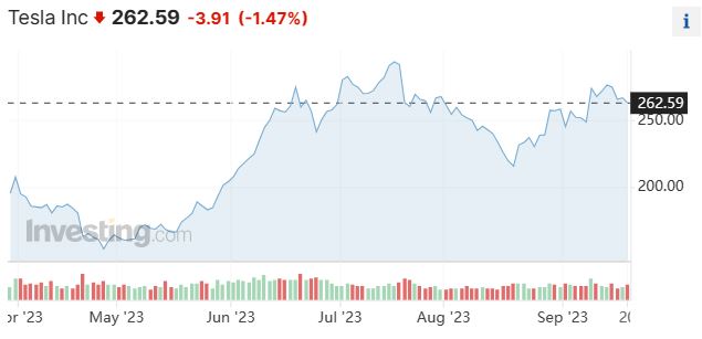 截至美股周二收盘,特斯拉收跌1.47%至每股262.59美元。