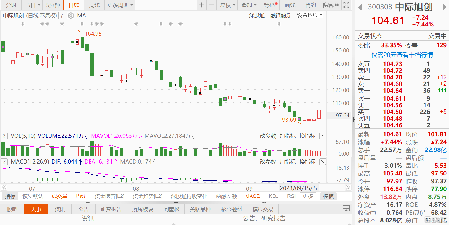 中际旭创(300308.SZ)涨超7%,报104.61元,总市值839.8亿元。中原证券研报指出,公司作为全球领先的光模块主力供应商,具备技术创新领先优势、快速量产交付能力、完善质量保证体系等优势,经营质量不断改善。公司800G产品需求和订单持续增加,正在开发1.6T光模块,2025年AI客户对1.6T产品需求有望释放。预计公司2023-25年归母净利润为16.13亿元、32.38亿元、42.32亿元,对应PE为48X、24X、18X,首次覆盖给予“买入”评级。