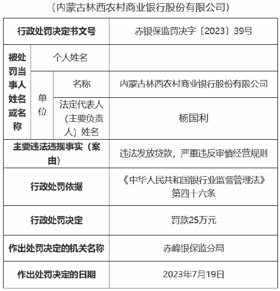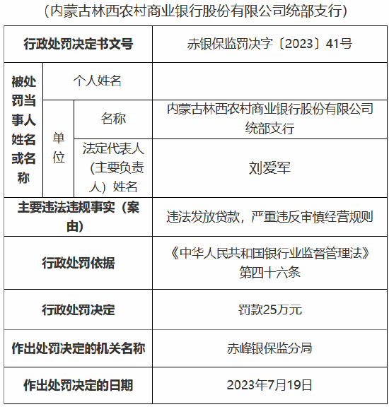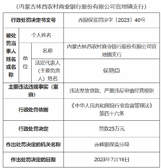 9月22日金融一线消息,国家金融监督管理总局赤峰监管分局行政处罚信息公开表显示,内蒙古林西农村商业银行股份有限公司、内蒙古林西农村商业银行股份有限公司官地镇支行、内蒙古林西农村商业银行股份有限公司统部支行因违法发放贷款,严重违反审慎经营规则,分别被罚款25万元。