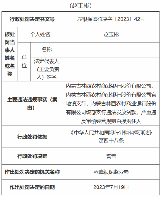 赵玉彬、于华金为以上三行违法发放贷款,严重违反审慎经营规则直接责任人,分别受到警告处罚。