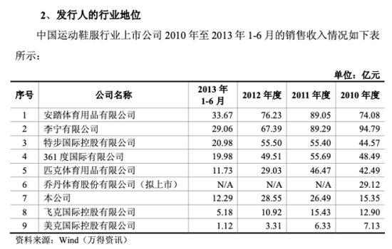 贵人鸟招股书显示,2012年公司的收入接近30亿元,与当时的匹克相当,约为特步的一半,安踏的37%。