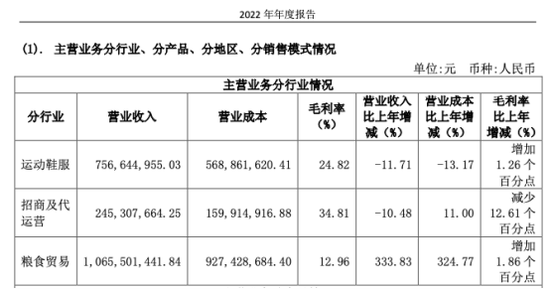 2022年,贵人鸟收入达到21亿元,同比增长近50%。其中,粮食贸易业务收入达到10.65亿元,同比增长333.83%,成为公司收入增长的主要来源。