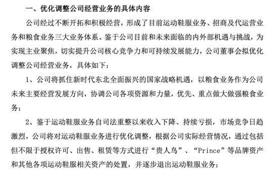 9月22日,贵人鸟公告称,将逐步退出运动鞋服业务,未来公司将以粮食业务作为主要经营发展方向。