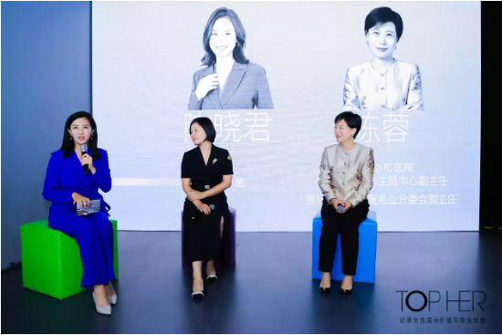 (从左至右:中央广播电视总台新闻主播玉蕾、美柚总裁陈晓君、北京协和医院妇科内分泌与生殖中心副主任、民建中央现代服务业分委会副主任陈蓉)