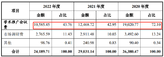 从绝对金额来看,“学术推广会议费”又是“市场与学术推广费”的绝对大头,2020年数据是1.9亿元,占比72%;2021年是1.25亿元,占比约43%;2022年是1.06亿元,占比44%。很显然,越是临近IPO,公司越是有意压缩了该方面费用,但无奈绝对值仍不算低,三年合计公司“开会”花掉4.2亿元。