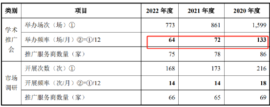 根据招股书等申报材料,报告期内,公司学术推广会、科室会的次数大幅下降,学术推广会场次分别为1495场、855场、751场,开会频率远高于同行业可比公司均值,科室会场次分别为96场、3场、16场。