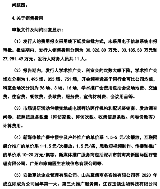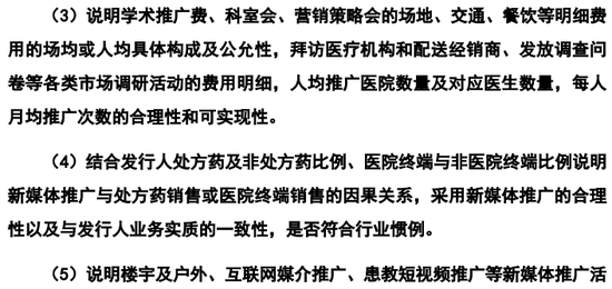 公司市场及学术推广费主要包括学术推广会议费用、市场调研费用和新媒体推广费用。公司学术推广会议包括为公司产品推广而开展的各类区域推广会、科室会、营销策略会,目的系向一线医务人员、经销商介绍产品特点、临床使用方法等,使其能够及时了解产品信息,了解产品的作用机理等。市场调研主要是委托推广服务商组织,通过拜访、分发调查问卷信息收集等方式获取市场基本情况、公司产品用户反馈情况、竞品市场信息等相关产品市场信息而进行的市场调研活动。新媒体推广主要是委托推广服务商以知名新媒体渠道、社区生活 APP、中高端社区门禁、患者教育科普短视频等作为载体,通过线上加线下的立体传播网络进行的产品市场推广。