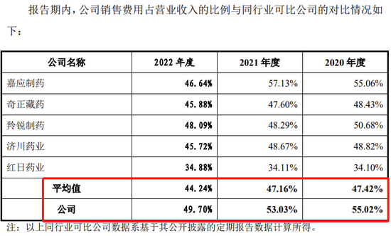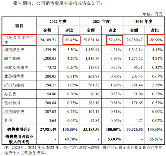 公司销售费用最大支出就是市场及学术推广费。2020年、2021年、2022年,市场及学术推广费分别为26380万元、29031万元、24190万元,占销售费用的比例分别为86.99%、87.48%、86.45%,占营业收入的比例分别为47.86%、46.39%、42.97%。