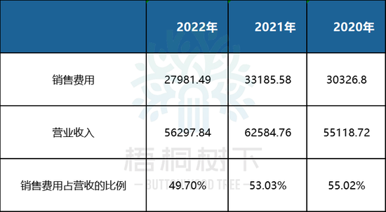 2020年、2021年、2022年,公司销售费用分别为30327万元、33186万元、27981万元,占营收的比例分别为55.02%、53.03%、49.70%。