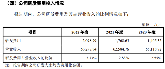2020年、2021年、2022年,公司研发费用分别为1405万元、1769万元、2099万元,占营业收入的比例分别为2.55%、2.83%、3.73%。与销售费用相比,无论绝对金额还是占比,研发费用都显得很小很低。
