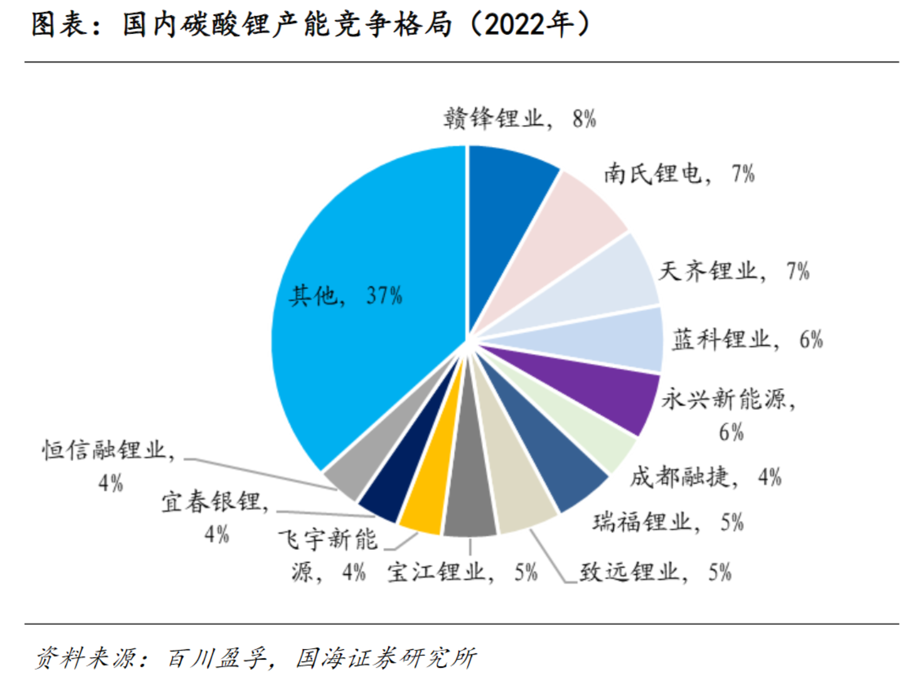 从目前产能竞争格局来看,赣锋锂业(8%)碳酸锂产能优势明显,南氏锂电(7%)、天齐锂业(7%)、蓝科锂业(6%)、永兴新能源(6%)、融捷股份(4%)等次之。
