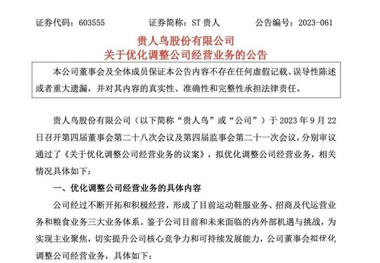 9月22日,ST贵人发布公告称,拟优化调整公司经营业务。鉴于运动鞋服业务自司法重整以来收入下降、持续亏损,市场竞争日趋激烈,公司将对运动鞋服业务进行优化调整,通过授权许可、出售、租赁等方式进行“贵人鸟”、“Prince”等品牌资产和其他各项运动鞋服相关资产的处置,并逐步退出运动鞋服业务。