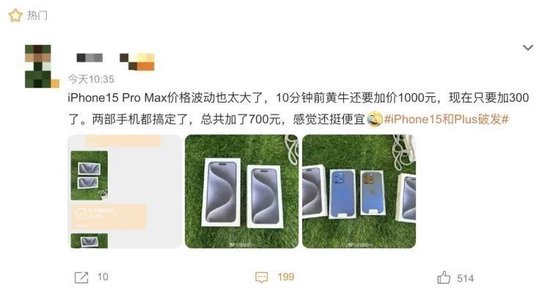 某数码博主的亲身经历证实了这种观点——“iPhone15Pro Max溢价太大了,十分钟前黄牛加价1000元,现在加价300元。”价格“跳水”速度之快令人惊讶。