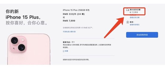 记者登录苹果官网发现,iPhone15、15Plus无论是何配色、型号,都是平均8个工作日即可取货,这在以往新发售的iPhone手机中很难见到。相比之下,15Pro系列市场情况相对较好,排队4-5周左右即可取货,部分1T版本需要等候6周以上。