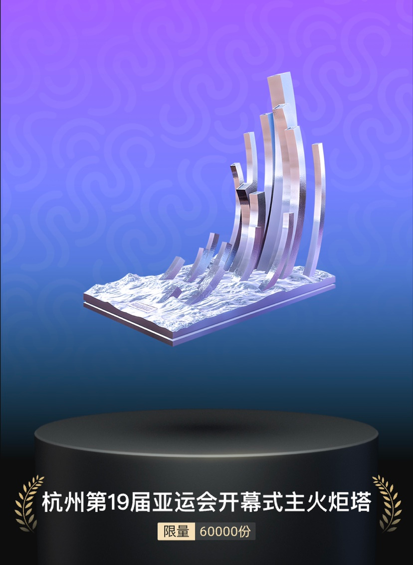 除此之外,在杭州亚运主火炬塔正式亮相后,杭州亚组委也通过支付宝上的鲸探小程序,同步发布亚运史上首个“数字主火炬塔”。它依托于实体装置进行设计,在外形设计与动态效果上力求最大程度还原真实形态,并通过三维渲染技术,成为首个可升级变形的亚运数字特许商品。