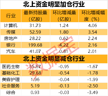 分行业来看,31个行业中有16个行业的北上资金持股量增长,计算机、传媒行业持股量环比增幅在3%以上。北上资金减持的行业普遍大幅下跌,社会服务、美容护理、基础化工行业减持幅度居前,行业指数均有明显跌幅。