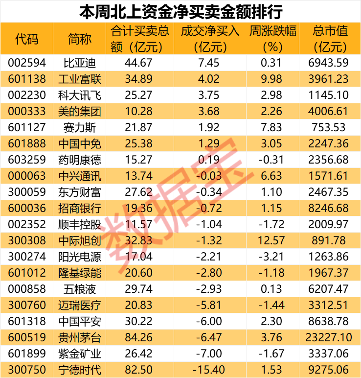 数据宝统计显示,本周共有37股登上北上资金成交活跃榜,所属行业来看,电气设备、食品饮料股本周成交活跃,合计买卖总额在100亿元以上。汽车行业个股获得净买入超5亿元,电气设备、食品饮料、非银金融行业个股净卖出居前。