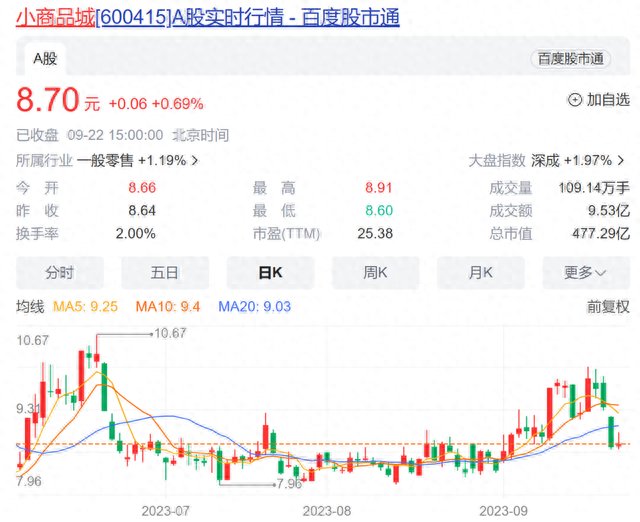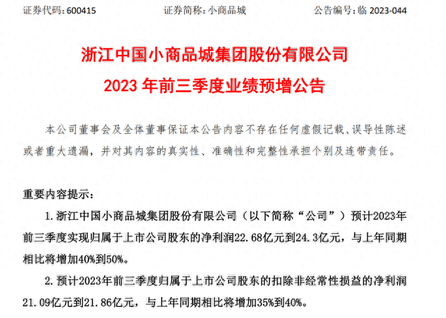 消息面上,此前一日(9月21日)晚间,小商品城发布2023年前三季度业绩预增公告,预计公司前三季度实现归母净利润22.68亿元到24.3亿元,同比将增加40%到50%。结合此前财报数据,尽管小商品城第三季度单季增速预计环比放缓,但今年前三季度总体净利润仍将创出历史新高。
