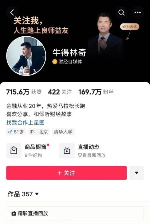 他的抖音号“牛得林奇”共发布了357个作品,内容涉猎财经热点话题、财商培养等,作品时长较短,话术轻松不深奥,获得了不错的传播效果。《年轻人为啥不换手机了?》《富士康的困境》《期房烂尾了房贷还用还吗?》等视频点赞都超过20万。
