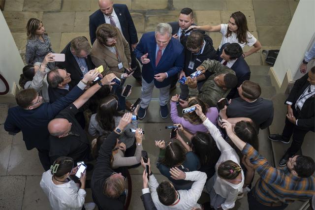 当地时间2023年9月22日,美国华盛顿特区,美国众议院议长麦卡锡被记者包围,他们正在寻找为政府提供资金,避免政府“关门”的最新计划。图/视觉中国