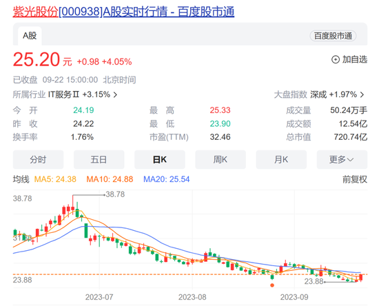 坐拥新华三,也让紫光股份成为炙手可热的CPO概念股,今年上半年(前复权)公司股票累计涨幅约63%。不过,今年下半年来人工智能板块回调,紫光股份股价累计下降约21%,最新收盘25.2元/股。