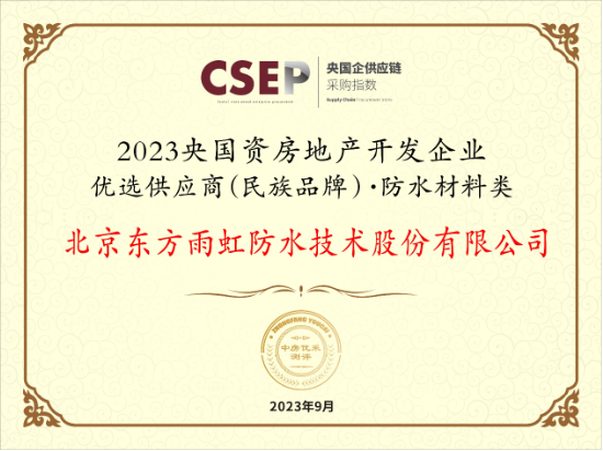 东方雨虹凭借强大的品牌实力、过硬的产品品质以及专业的系统服务,以21%的样本优选率荣登“2023央国资房地产开发企业优选供应商(民族品牌)·防水材料类”榜首,并成功入选“2023央国资房地产开发企业优选供应商(民族品牌)·涂料保温防水一体化类、密封胶类”榜单。