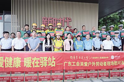 中工网讯 9月21日,“关爱健康,暖在驿站”广东工会关爱户外劳动者捐赠慰问活动在广州琶洲工会爱心驿站启动。省总工会党组成员、副主席杜玲,广东省职工发展基金会理事长田紫光,广州市总工会、邓老金方集团公司有关负责人及户外劳动者代表出席活动。