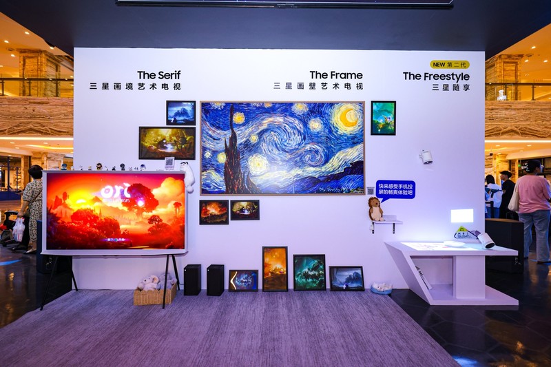 现场展出的三星Lifestyle艺术系列产品展现了科技与艺术碰撞的魅力。The Serif画境艺术电视与多种家居装修和谐搭配,随心百变的产品特性轻松串联不同家装格调,在方寸之间演绎独家创新美学。云白色彩更是为电视增添了符合当下潮流的时尚之美,为室内装饰锦上添花。