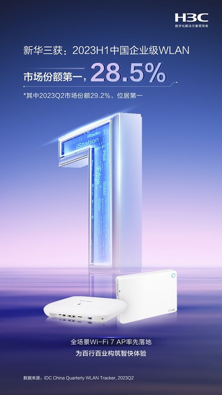 日前,根据国际数据公司IDC发布的《 中国WLAN市场季度跟踪报告(2023Q2)》显示,紫光股份旗下新华三集团以28.5%的份额,斩获2023年第二季度中国企业级WLAN市场第一。凭借持续不断的技术创新、产品迭代和落地实践,新华三集团已连续14年稳居企业级WLAN市场前列,成为行业市场的实力领航者。