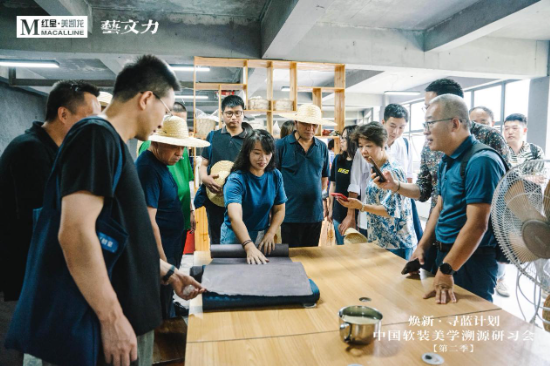在青于蓝古法蓝靛膏生产基地,研习会成员们感叹于从“一片板蓝根枝叶”到“一个蓝染产业”的巨大跃迁。在苗族蜡染刺绣州级非物质文化遗产传承人杨再蓉的带领下,大家亲手体验蜡染和扎染工艺,思考色彩、纹样与现代家居软装的连接。