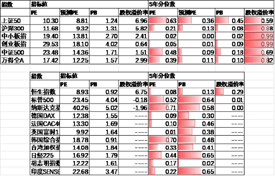 近期万得全A预测PE12.25倍,处于11%分位水平,股权溢价率2.99%,处于82%分位水平。整体看A股估值处于合理水平。