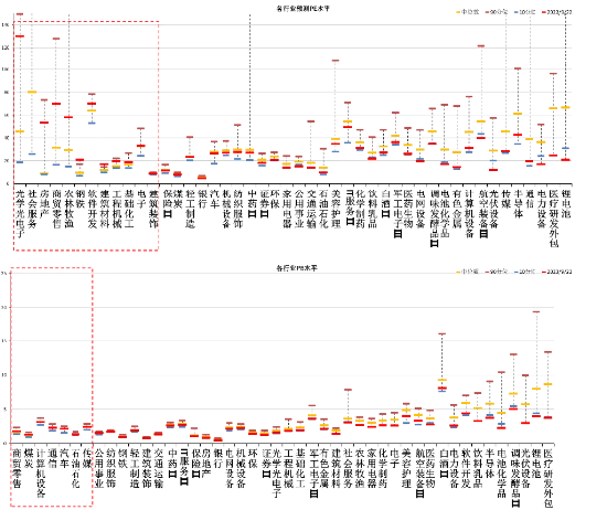 分行业看,极少数行业PE估值水平高于过去5年估值中位数,不到半数行业PB估值水平高于过去5年估值中位数,社会服务、房地产估值较高。