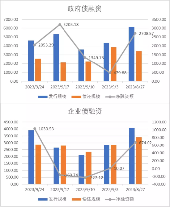 债券融资方面,上周政府债净融资额2053.29亿,较此前有所回落;企业债净融资额1030.53亿,较此前有所回升。