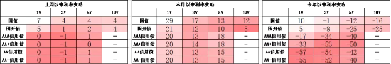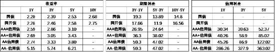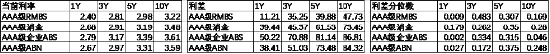 永续债方面,利率走势大体上行,其中3YAA及AA-下行幅度最大,达1.29BP;10Y上行幅度最大,达4BP。
