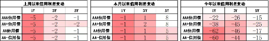 信用利差方面,上周利率债上行使得利差收窄,目前大部分1Y券种仍位于偏低区间,而大部分3Y及5Y券种的信用利差分位数位于中性区间。