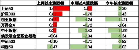 A股表现来看,上周主要板块大体呈上行,其中上证50涨1.43%,涨幅最大;科创50指跌0.47%,跌幅最大。经济数据高于预期叠加北向资金流入转正背景下A股出现了一定的回升。偏股基金指数跌0.04%.