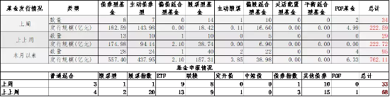 基金申报与发行方面,上周共计申报基金33支,其中普通混合型基金3支,债券类基金(11支)少于股票类基金(19支),FOF基金申报0支。发行一边,上周基金共计发行222.59亿,发行规模持平上上周,其中主动股票及偏股混合型基金发行规模有所回升。