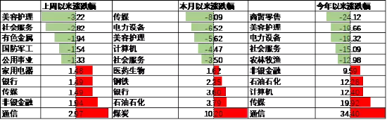 行业方面,上周31个申万一级行业中17个上涨,14个下跌。其中,TMT行业上周反弹力度较大,通讯及传媒行业分别涨2.97%及1.49%,涨幅最大。此外,大盘价值风格中非银及银行分别涨1.94%及1.49%,表现较好。另一方面,消费行业中美容护理及社会服务行业上周表现不佳,分别跌3.22%及2.82%,跌幅最大。此外,随着我国经济预期有所回暖,公用事业行业上周跌1.33%,跌幅居前。